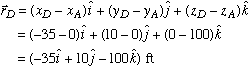 Example 4: An antenna tower is held in the vertical position with the help of three cables. The tensile force in cable AB is 2,000 lb, in AC is 2,500 lb, and in AD is 2,200 lb. Based on the geometry shown below, determine