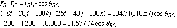 Part b: To find the angle between cables AB and AC, we use the dot product between any vector along AB with any vector along AC. Recall that the dot product between two vectors can be expressed as