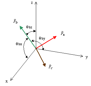For clarity only the angles for force Fb are shown in the figure below. For the other two force vectors the angles are measured in a similar way from positive x,y,z axes. Keep in mind that only two out of three direction angles are specified as the third angle can be found from the relation