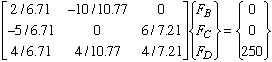 We can either use the back substitution to solve for cable force, or simply write the three equations in matrix form and solve them simultaneously as shown below
