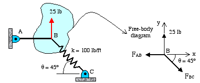 The force in cable AB is along its length so is the force in spring BC. The free-body diagram shows a system of three concurrent forces.