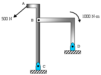 Draw FBD of ABC: Member ABC is supported by a smooth pin at A, and is connected to member BD by a pin connection at B. We have to be careful here. Although BD may appear to be a two-force member, a closer examination indicates that it is NOT. This is due to the fact that there is a couple moment acting on member BD. Therefore, it is no longer a two-force member. So in this case, we do not know the direction of force at point B, and we have to show it in terms of its two components. Now we can proceed to draw the FBD of ABC as shown below.